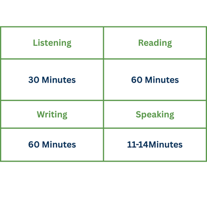 The IELTS test lasts 2 hours and 45 minutes. Listening, Reading, and Writing are completed consecutively on the same day. The Speaking test is scheduled separately, either the same day or within the next few days.